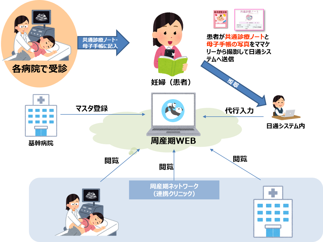 現状、「共通診療ノート」は、紙媒体にて管理・運用している為、妊婦さんが受診時に忘れた場合や紛失してしまった場合、緊急時などに対応が出来ない、母子手帳情報と比較しづらいなど、不便な事象が発生しています。そこで、「共通診療ノート」と「母子手帳(ママケリー)」の情報をウェブ上で一元管理する仕組み「周産期WEB」を構築することで現状の課題を解決します。